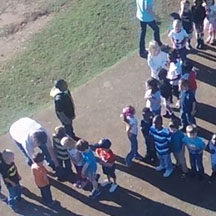 The children wait in line to see themselves from the drone
